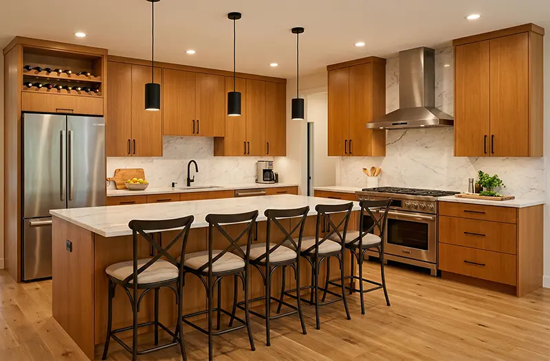 Yes — simple crown moulding, furniture-leg island bases, or open shelf brackets can add traditional warmth without tipping into full traditional design. Our team will calibrate the right detail level for your space and preferences.