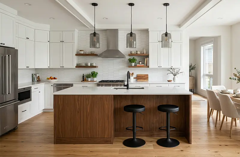 Combining real wood warmth with painted finish crispness — white oak island paired with painted shaker perimeter, walnut veneer base cabinets with painted white uppers, or natural maple open shelving replacing upper cabinets against a painted background.